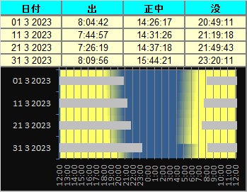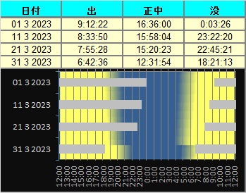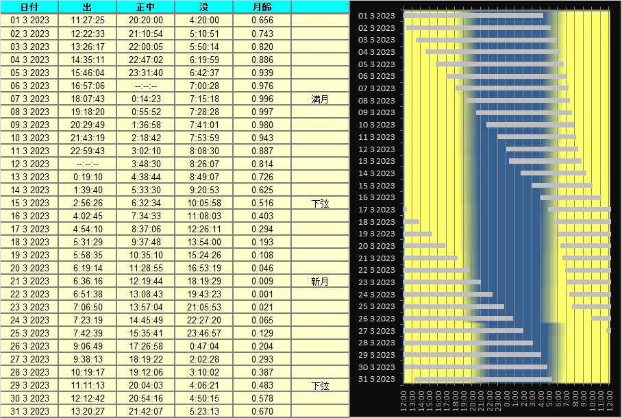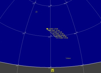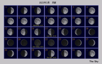 日付 時刻 方角 高度(度) イベント 2 19 西 15度 金星と木星た接近(間隔0.7度) 16 海王星が太陽と合 17 水星が太陽と外合 20 春分 22 19 西 10度 木星が月に接近(間隔2.4度) 24 12 南東 45度 金星が月に接近(間隔3.1度) 24 19 西 30度 金星が月に接近(間隔3.1度) 24 21 西 10度 天王星が月に接近(間隔3度) 26 0 西 10度 月がプレアデス星団に接近 28 19 南 60度 火星が月に接近(間隔3度) 28 19 西 10度 木星と水星が接近(間隔1.6度) 30 20 西 30度 金星と天王星が接近(間隔1.2度)