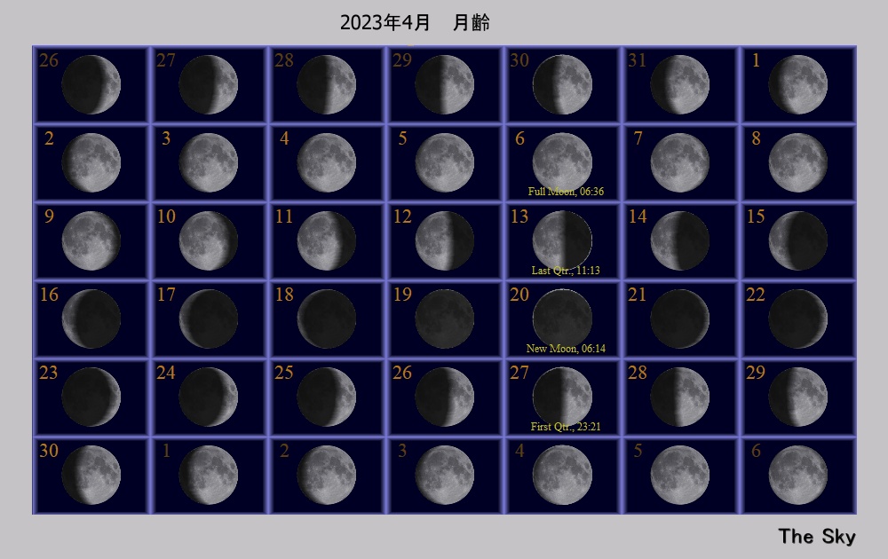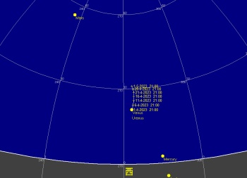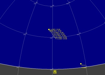 日付 時刻 方角 高度(度) イベント 11 木星が太陽と合 20 金環皆既日食(欧州から観望不可) 23 13 東 45度 金星が月に接近(間隔0.8度) 23 20 西 30度 金星が月に接近(間隔2.6度) 26 1 西 10度 火星が月に接近(間隔3.1度)