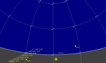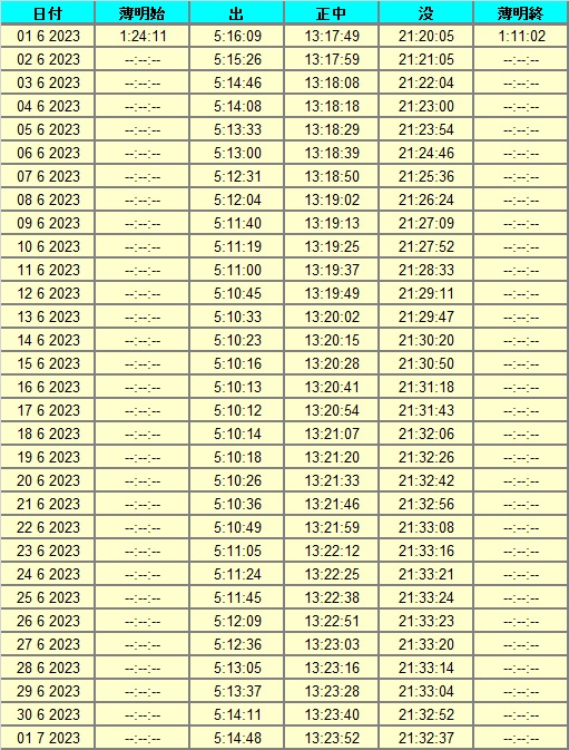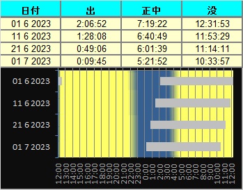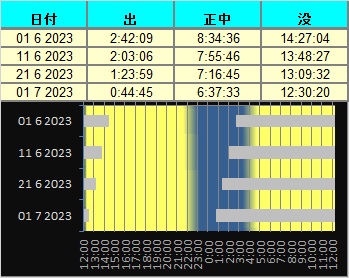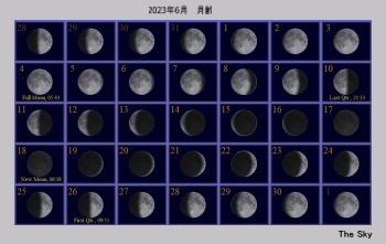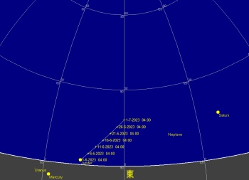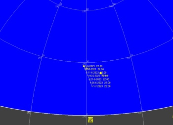 日付 時刻 方角 高度(度) イベント 4 金星が東方最大離隔 10 2:00 東 10度 土星が月に接近(間隔3.8度) 14 4:00 東 10度 木星が月に接近(間隔1.7度) 21 夏至 21-22 22:00 西 15度 月、金星、火星のランデブー
