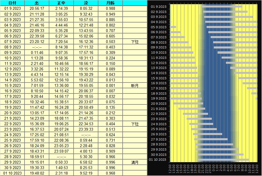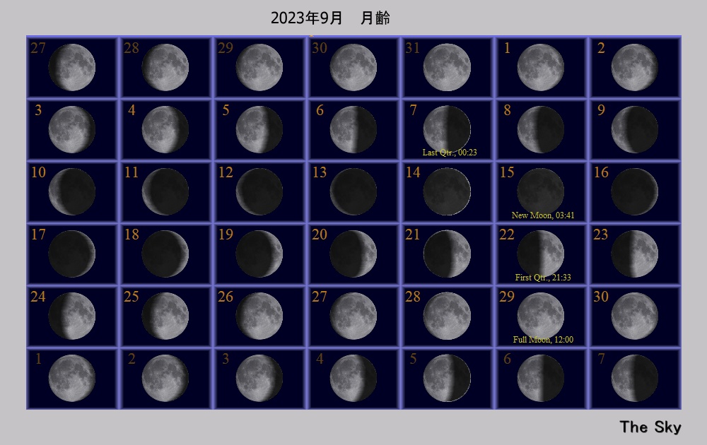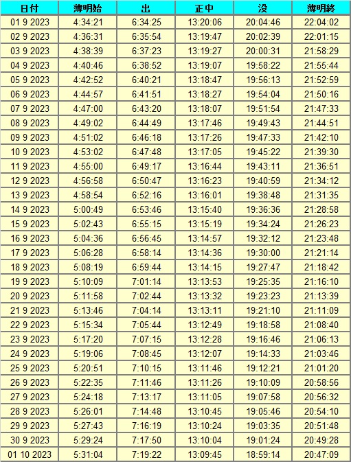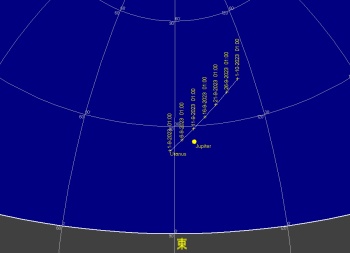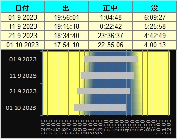 日付 時刻 方角 高度(度) イベント 1 ぎょしゃ座α流星群極大 4 22:00 東 10度 木星が月に接近(間隔3.1度) 6 水星が内合 19 金星が最大光度(ー4.8等) 22 水星が西方最大離隔 23 秋分 27 2:00 南西 15度 土星が月に接近(間隔3.7度)
