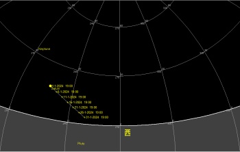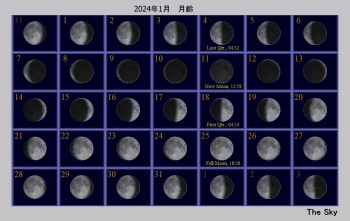 日付 時刻 方角 高度(度) イベント 3 地球が近日点を通過(14万7千km) 12 水星が西方最大離角 14 18 南西 20 土星が月に接近(間隔3.9度) 18 20 南 50 木星が月に接近(間隔2.1度) 19 21 南 60 天王星が月に接近(間隔3度)