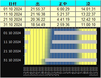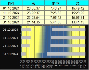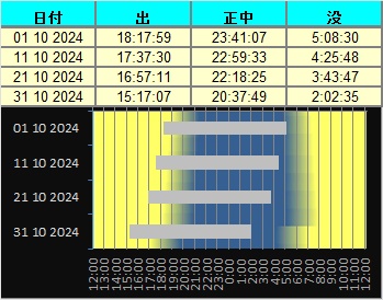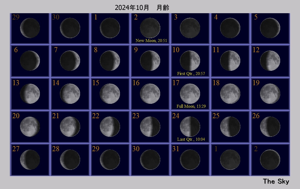 14 19:00 南西 15度 土星が月に接近(間隔0.9度) 15 19:00 東 10度 海王星が月に接近(間隔0.5度) 21 7:00 西 50度 木星が月に接近(間隔5.5度) 23 24:00 東 10度 火星が月に接近(間隔3.4度) 24 オリオン座流星群極大 27 ドイツ夏時間終了