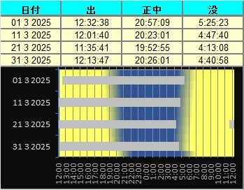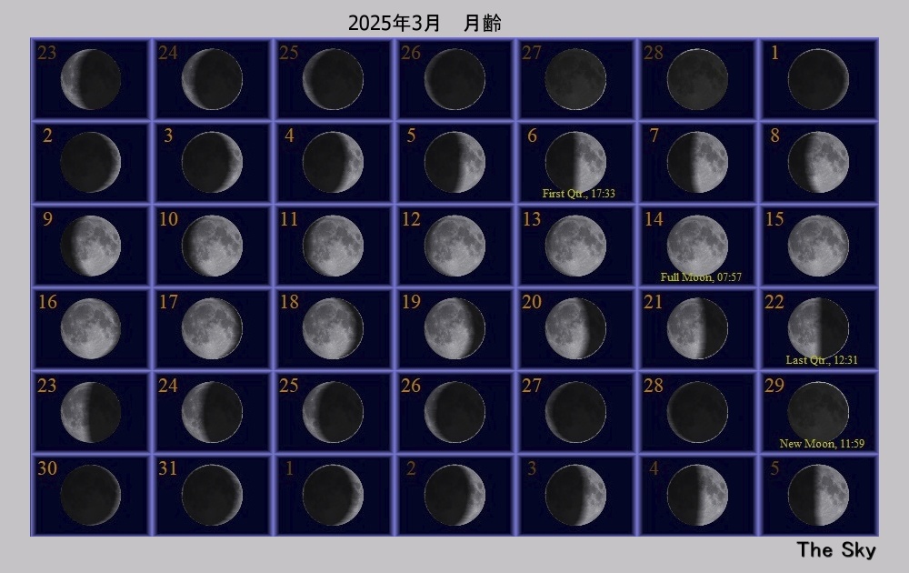 日付 時刻 方角 高度(度) イベント 1 月が近地点を通過(361918km) 4 水星の近日点を通過 8 水星が東方最大離角 9 3:00 西 15度 火星と月が接近(間隔0.9度) 12 19:00 西 10度 金星と水星が接近(間隔5.5度) 12 土星が合 14 7:59 皆既月食(月没帯食の一部観望可) 17 月の遠地点を通過(405781km) 20 海王星が合 20 春分 23 金星が内合 23 土星の環の消滅 24 水星が内合 29 12:11 部分日食(食最大12:11) 30 欧州で夏時間始まる