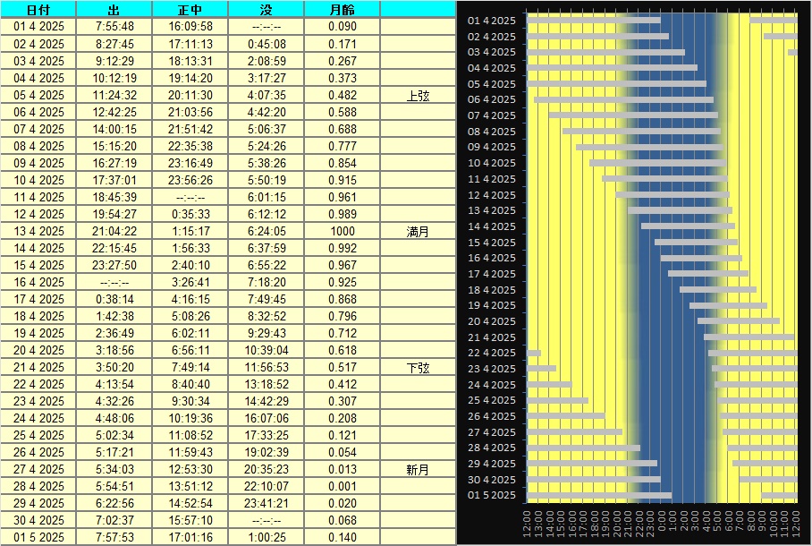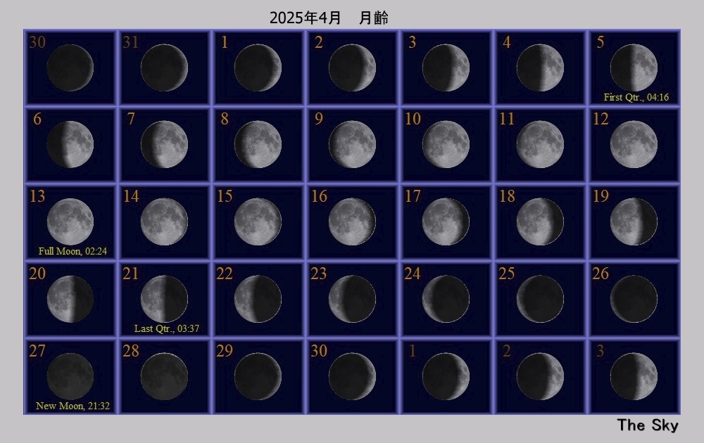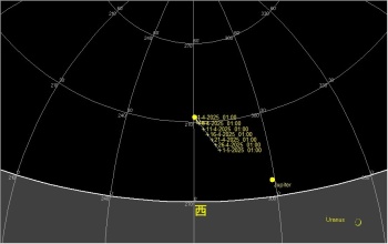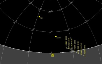 日付 時刻 方角 高度(度) イベント 2 23:00 西 15 木星が月に接近(間隔4.9度) 5 22:00 南西 50 火星が月に接近(間隔1.6度) 11 5:00 東 5 水星と土星が並んで昇る(日出直前で観望難しい) 14.4.-15.5 東 5 金星、海王星、土星、水星のランデブー(日出直前で観望難しい) 15 5:30 北東 スワン彗星 C/2025 F2 が明るくなる 25 5:00 東 5 金星と月が接近(間隔3.1度) 27 東 5 金星が最大光度 -4.8等 30 21:00 西 30 木星が月に接近(間隔4.9度)