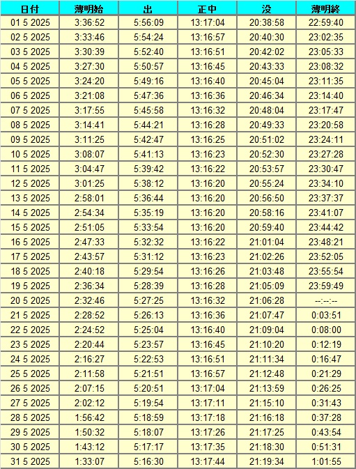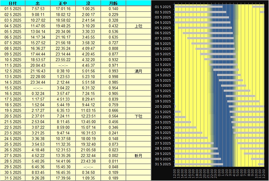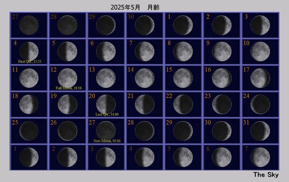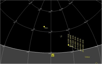 日付 時刻 方角 高度(度) イベント 14.4.-15.5 東 5 金星、海王星、土星、水星のランデブー(日出直前で観望難しい) 1 スワン彗星 C/2025 F2 が近日点を通過(49.880.000km) 4 1:00 西 15 火星が月に接近(間隔1.2度) 5 23:00 西 40 火星とプレセペ星団が接近 6 5:00 東 10 土星の環が消滅 18 天王星が太陽と合 26 月が近地点を通過(359.105km) 24 4:00 東 5 金星が月に接近(間隔4.2度) 28 22:00 北西 10 木星が月に接近(間隔5.7度) 30 水星が内合 30-31 23:00 西 20 細い月とプレセペ星団が接近