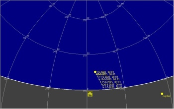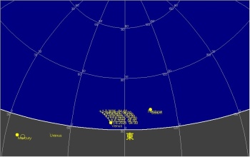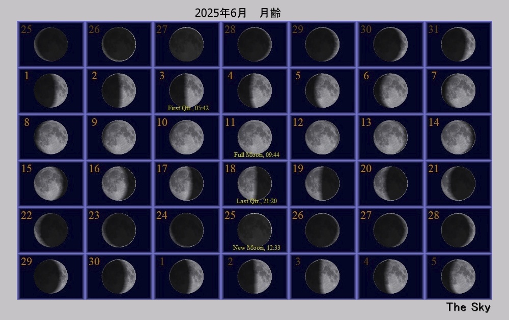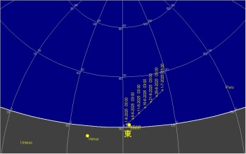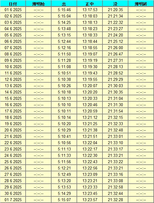 日付 時刻 方角 高度(度) イベント 1 金星が西方最大離角 1 22:00 西 40 金星が月に接近(間隔5度) 19 3:00 東 15 土星が月に接近(間隔2度) 21 夏至 22 4:00 東 15 金星が月に接近(間隔5,9度) 24 木星が合 29 2:00 東 10 海王星と土星が接近(間隔1度) 27 6月うしかい座流星群が極大 29 22:00 西 20 レグルスと火星と月が接近(間隔2.5度)