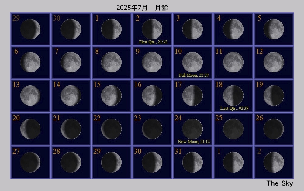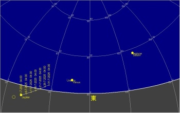 日付 時刻 方角 高度(度) イベント 3 地球が遠日点を通過(152.090Mio.km) 4 水星が東方最大離角 16 3:00 南東 30 土星が月に接近(間隔4,2度) 月が近地点(368042km)を通過 23 5:00 東 15 木星が月に接近(間隔4,3度) 28 21:00 西 15 火星が月に接近(間隔2,1度) 31 みずがめ座δ流星群 極大