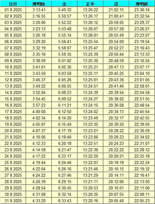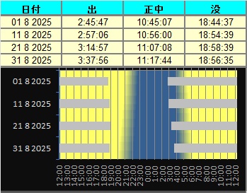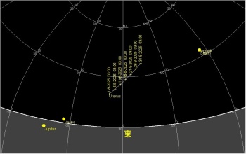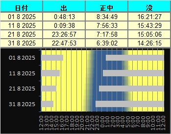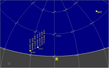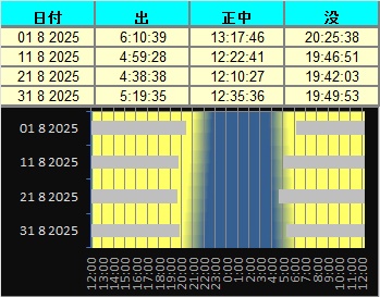 日付 時刻 方角 高度(度) イベント 6 0:00 東 15 土星と海王星が接近(間隔1.1度) 12 4:00 東 10 金星と木星が接近(間隔0.9度) 12 22:00 東 10 月と土星が接近(間隔6.1度) 13 15:00 ペルセウス座流星群が極大(輻射点は23時頃に北東20度) 17 0:00 北西 10 月とプレアデス星団が接近(日本ではプレアデス食 JST:0時) 19 水星が西方最大離角 19-20 4:00 東 15 月と金星と木星のランデブー