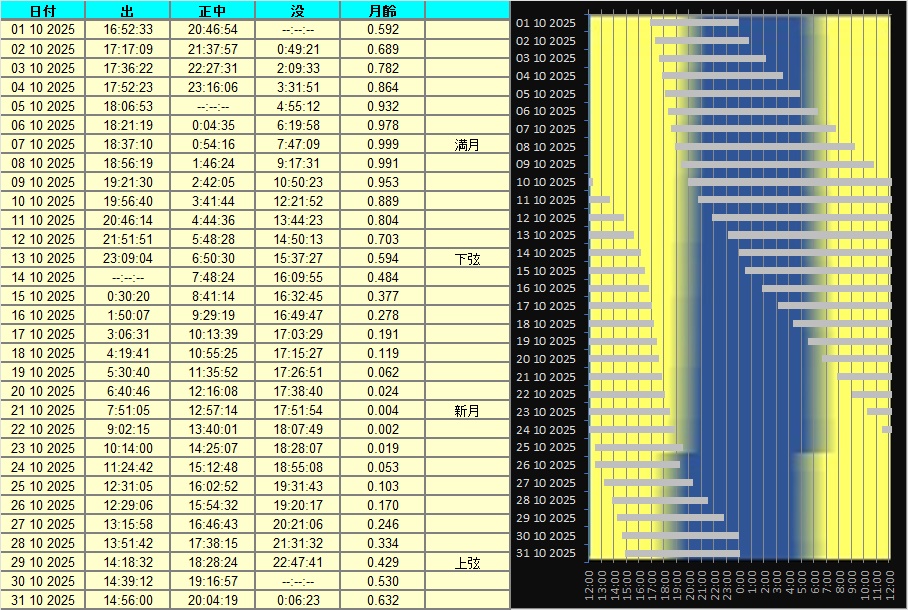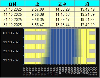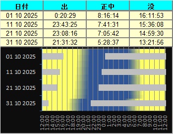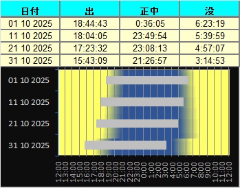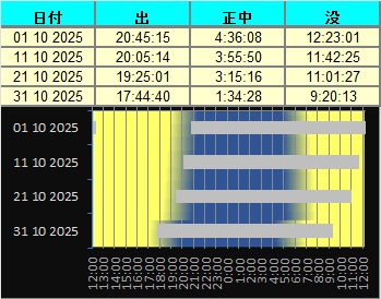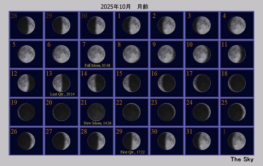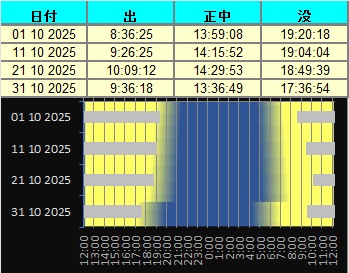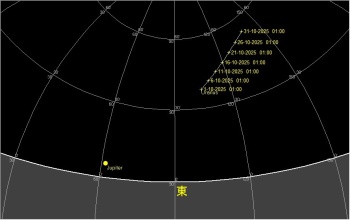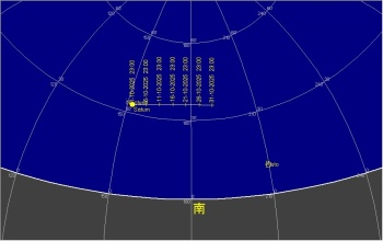 日付 時刻 方角 高度(度) イベント 2 金星が近日点を通過 6 2:00 南西 30 土星が月に接近(間隔2.9度) 8 月が近地点(35万9813km) 8 ジャコビニ流星群が極大 14 1:00 東 15 木星が月に接近(間隔3.6度) 19 1:00 東 15 木星が明るい(-2.3等) 19 7:00 東 10 金星が月に接近(間隔6.1度) 21 オリオン座流星群が極大 24 月が遠地点を通過(40万6366km) 26 夏時間終了