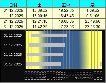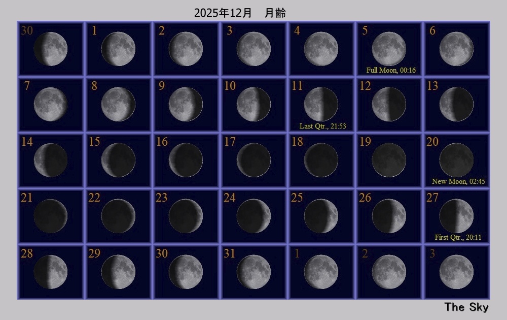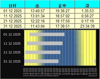 日付 時刻 方角 高度(度) イベント 4 月が近地点(357089km)を通過 7 水星が西方最大離隔 7 20:00 東 10 木星が月に接近(間隔3.6度) 14 ふたご座流星群極大 21 冬至 26 23:00 西 10 土星が月に接近(間隔3.8度)